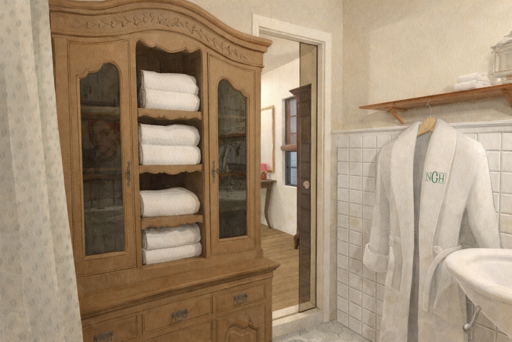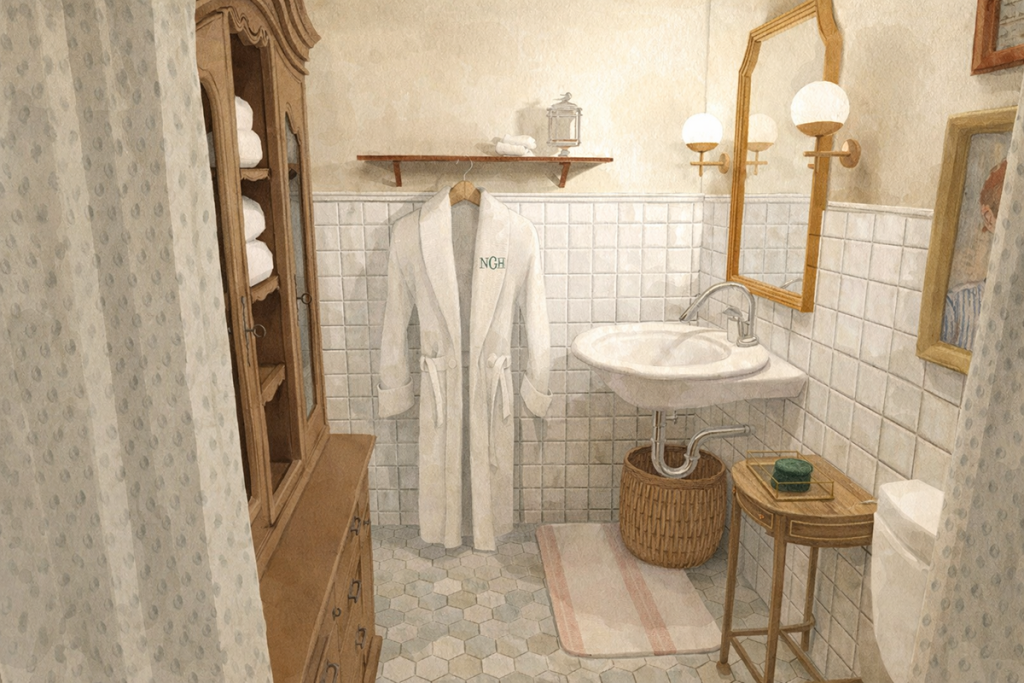 So we will be adding a small antique china hutch for storing towels, toiletries, etc. I also found a beautiful antique brass hanging shelf in our attic that I’ll be using for hanging robes and additional items for guests. I found the perfect little table at one of my favorite antique stores that will sit between the sink and toilet for additional surface space when getting ready.