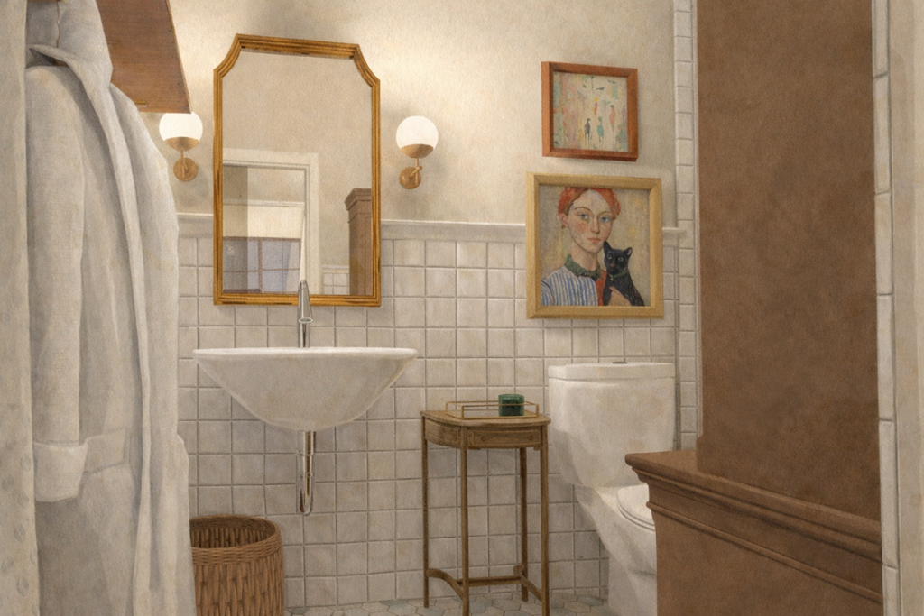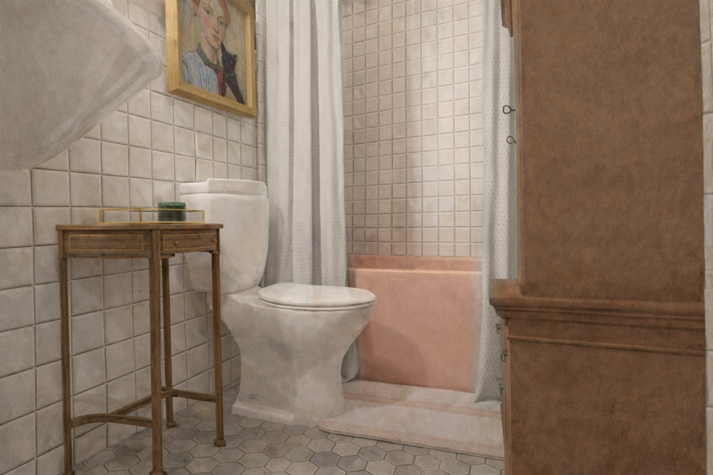 I second-guessed myself all the way until the entire room was painted and I saw it on the walls with the lights installed and on. But I’m excited to say it was the right choice. Oat Milk was too light and blended too well with the wall tile—needed a tad more drama. Loggia was too dark for the small space and too warm with the pink tub. So Slumber Sloth it was.