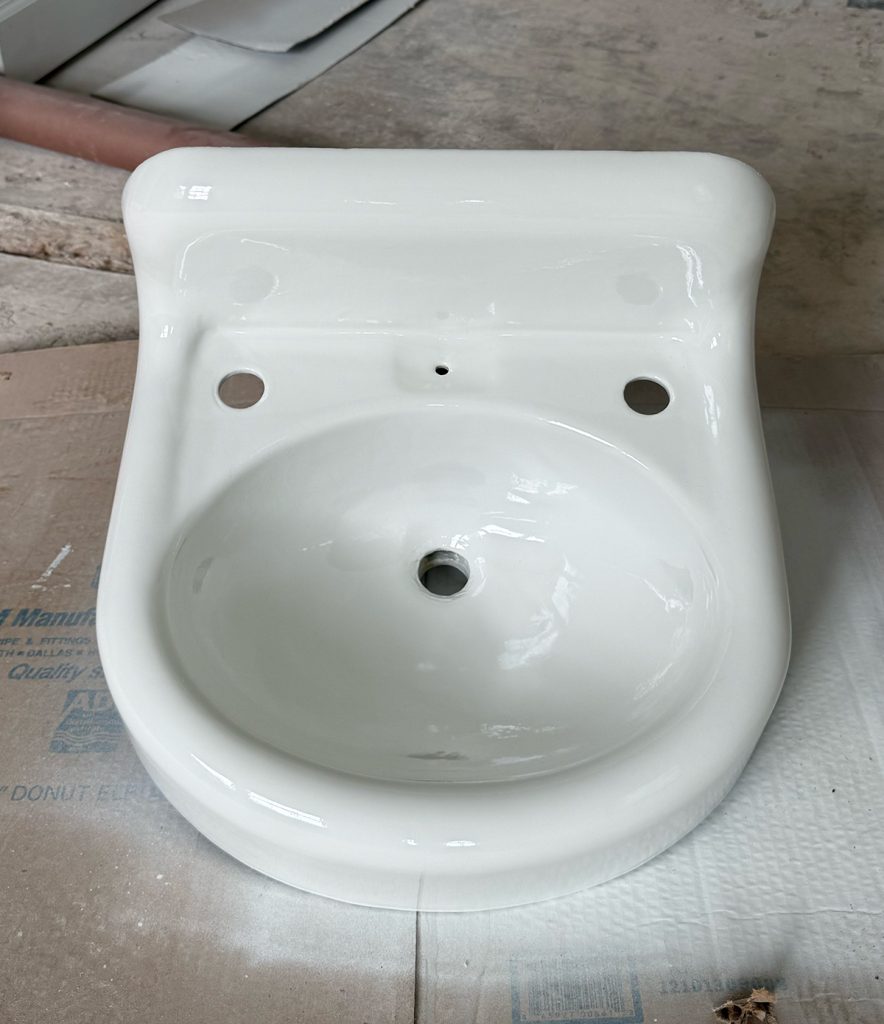 She ended up being quite the challenge. She had a lot of rust to clean out and refinish, but also posed a challenge in functionality, so we had to get creative when ordering fixtures. The original fixtures were still intact but would not work for this space, as there was one faucet for cold and one for hot. To get warm water, you’d have to mix it in the bowl. Unique and nostalgic, but not functional for guests. So John at National Wholesale Supply was able to come up with a great solution with one hot/cold faucet and a soap dispenser to fill the other spot. Much more functional.